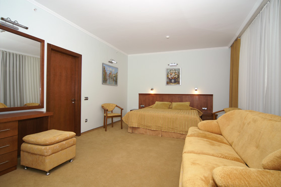 Номер "Люкс": две комнаты - спальня с большой кроватью и гостиная; индивидуальная система кондиционирования; телевизор; телефон; два санузла - один гостевой с душевой кабиной , второй для проживающих с большой угловой ванной; выход на террасу или балкон.