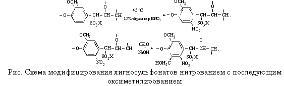 В проведённых экспериментах исходные лигносульфонаты подвергали нитрованию, оксиметилированию, вводили в их состав акриловую и метакриловую кислоты и ряд других способов. Наиболее эффективными оказались нитрование с последующим оксиметилированием (рис.) и прививка акриловой кислоты.
