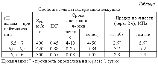 Из полученных данных следует вывод, что по разработанной технологии можно получать сульфатсодержащие вяжущие с различными сроками схватывания в зависимости от степени нейтрализации шлама. При этом вяжущие соответствуют маркам по прочности Г5 - Г7 по ГОСТ 125-79.