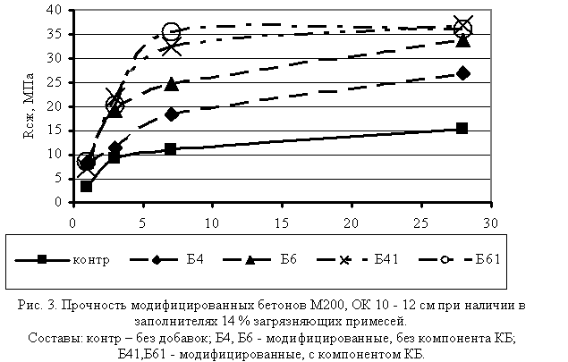 Проведенные заводские испытания показали, что при использовании рядовых заполнителей и портландцемента М400 Д 5 - Д 20 можно получить быстротвердеющие бетоны с высокими эксплуатационными характеристиками. Изделия, изготовленные в производственных условиях из модифицированных бетонных смесей за сутки твердения без дополнительной тепловой обработки, в зависимости от исходной марки, набирали от 60 - до 90 % проектной прочности. Комплексные модификаторы придают бетонным изделиям сульфатостойкость, повышают водонепроницаемость до 14 - 16 атмосфер, морозостойкость - до 500 циклов попеременного замораживания - оттаивания. К двадцативосьми суткам твердения в естественных условиях прочность изделий из модифицированных бетонов составляет 130 - 200 % проектной.