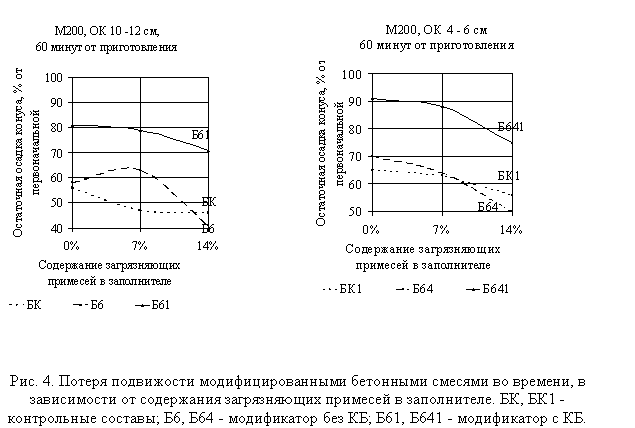 Быстрый рост прочности составов модифицированных «СП + Na2SO4 + МК» отразился на сокращенных сроках схватывания, что является характерным признаком для любых смесей, содержащих ускоритель твердения. Кроме наличия электролита на сокращение времени живучести бетонных смесей, как модифицированных, так и не содержащих добавок, значительное влияние оказывают загрязняющие примеси в заполнителе, количество которых в местных материалах достигает в щебне 4-6 %, в песке 6-8 % от массы. На рис. 4 проиллюстрированы результаты эксперимента по определению сохранения подвижности бетонными смесями, в зависимости от количества загрязняющих примесей. Дополнительное применение в составе модификатора компонента КБ устраняет эффект быстрого загустевания бетонных смесей с комплексными добавками.