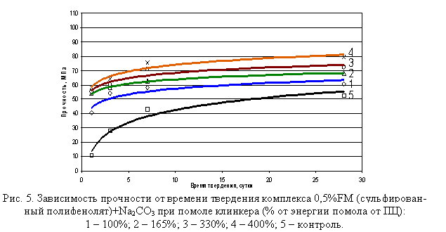 Следующее отличительное свойство таких цементов – быстрый набор прочности (рис. 5). Суточная прочность безгипсового ПЦ может превышать марочную рядового цемента. По данным F. Skvara камень безгипсового ПЦ оптимального состава через 6 часов имел прочность около 40 МПа. Микроструктура камня представлена однородной тесной смесью С-S-H – геля, мелкодисперсного портландита и AFm-фазы.