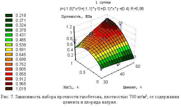 Кроме того, такие системы обладают ускоренными по сравнению с классическим цементно-песчаным неавтоклавным газобетоном темпами набора пластической прочности. При этом, скорость твердения массива можно легко регулировать, изменяя вид и количество вводимой химической добавки. Так, статистическая обработка влияния ускорителей твердения на развитие прочности неавтоклавного газобетона на основе ряда разных проб зол позволила выявить, что более быстрыми темпами набирается ранняя прочность газобетона с добавкой хлорида натрия, при этом она прямо пропорциональна и превышает прочность контрольного цементно-песчаного состава примерно в 10 раз (рис. 7). Наличие же золы позволяет обеспечить непропариваемое твердение газобетонных блоков. В то же время, за счет высокой активности системы блоки проходят ТВО за счет саморазогрева до 60 - 80 оС.