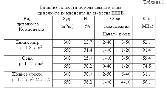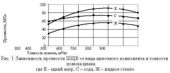 В качестве алюмосиликатной составляющей в работе использован гранулированный доменный шлак Орско-Халиловского металлургического комбината (ОХМК, Мо=1,001, Ма=0,205, Кк=1,4), а в качестве щелочных компонентов - водные растворы едкого натра, соды и жидкого стекла. Шлак измельчался в лабораторной мельнице МПЛ-1 до удельной поверхности 300-900 м2/кг (по ПСХ-9). Прочность образцов определялась после ТВО.