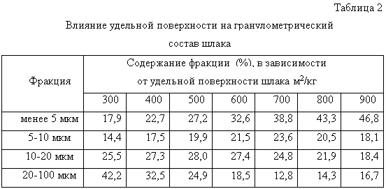 Удельная поверхность и гранулометрический состав в значительной степени определяют свойства минеральных вяжущих веществ. Для каждого вида вяжущего установлена тонкость помола, рационально подобранная с точки зрения обеспечения определенного уровня свойств при оптимальном расходе энергоресурсов. Для шлакощелочных вяжущих (ШЩВ) в соответствии с ТУ 67-1020-89 "Вяжущее шлакощелочное" и Рекомендациями НИИЖБ [1] удельная поверхность шлака должна составлять не менее 250-300 м2/кг (по остатку на сите .008 не более 9-10%). Анализ известных исследований показал различие в мнениях относительно величины удельной поверхности, обеспечивающей максимальную активность ШЩВ. По разным данным она составляет 350-400 м2/кг [2], 450-550 м2/кг [3], 600 м2/кг [4]. Что касается гранулометрического состава, то по результатам работы [5] решающее значение на рост прочности оказывают фракции до 5 мкм.