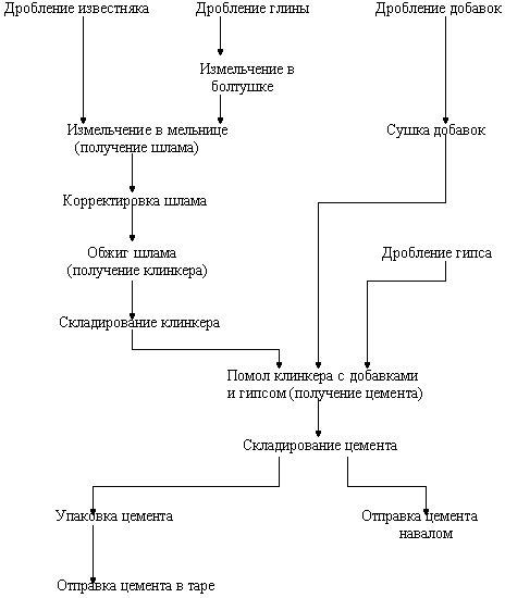 На цементных заводах, работающих по мокрому способу, в качестве сырьевых материалов для производства портландцементного клинкера обычно используют мягкий глинистый и твердый известняковый компоненты. В этом случае технологическая схема производства цемента выглядит следующим образом: